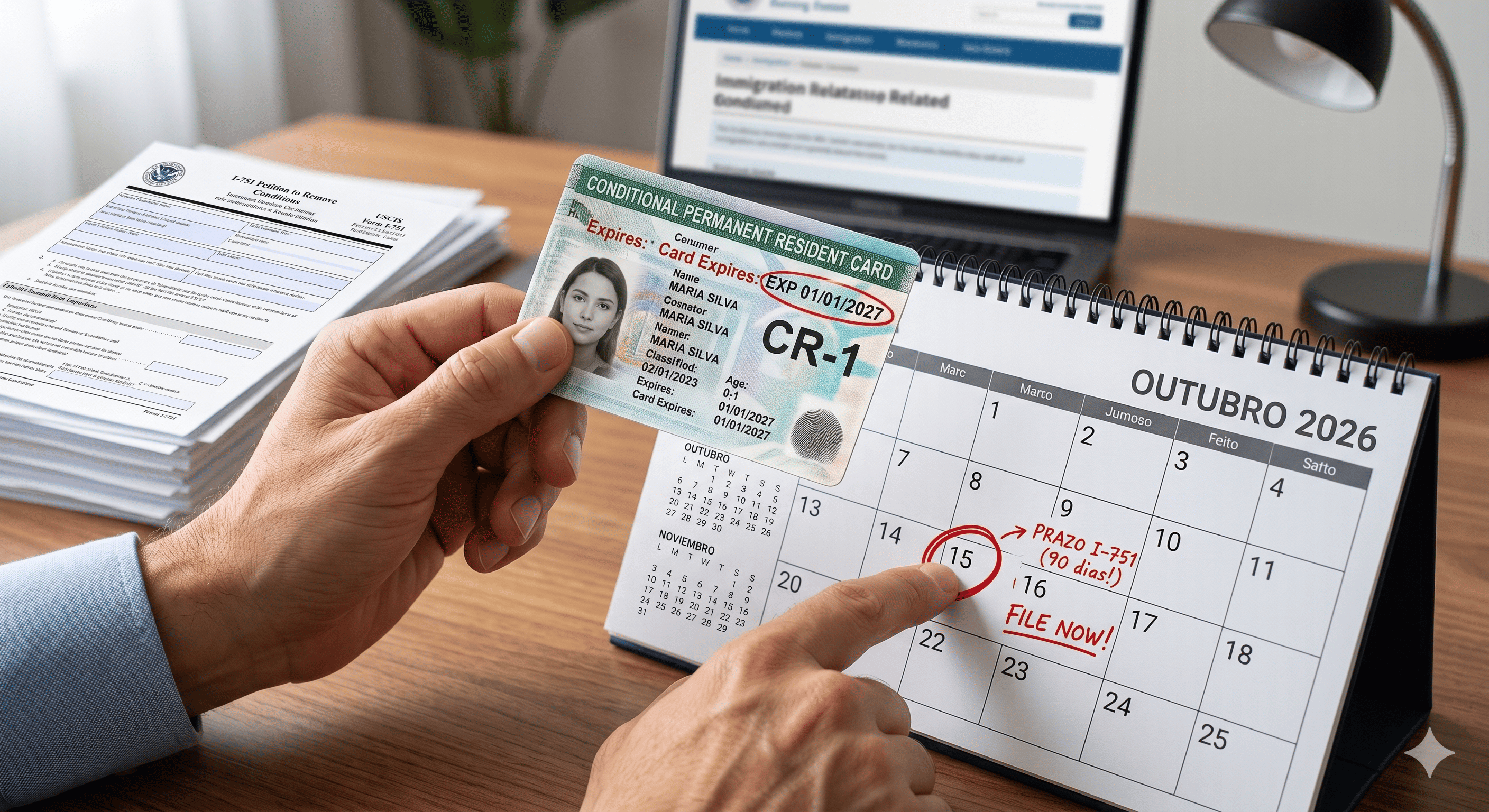 O titular do green card condicional deve protocolar o formulário I-751 dentro da janela de 90 dias que antecede a data de vencimento do cartão. Protocolar antes desse período resulta em devolução da petição. Protocolar depois, sem justificativa aceita pelo USCIS, pode levar à negativa e ao início de um processo de remoção (deportação).